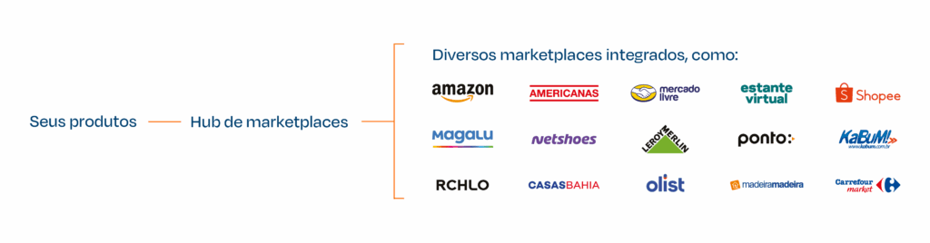 Um hub integrador de marketplaces é a solução ideal para esse cenário. Ele funciona como uma plataforma de gestão centralizada, que conecta sua loja virtual ou sistema de vendas a diversos marketplaces, como Amazon, Mercado Livre, Magalu, Shopee e outros.